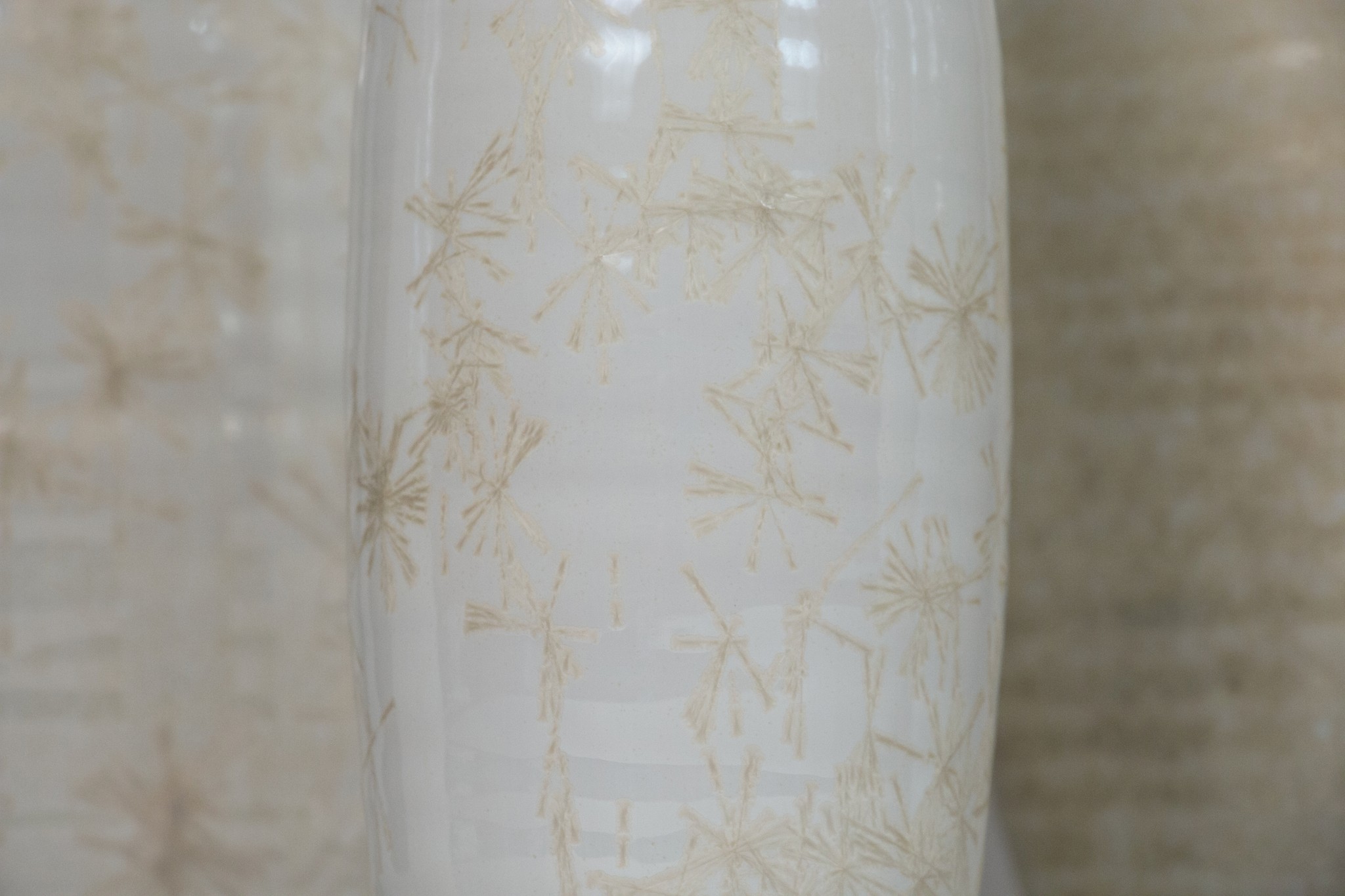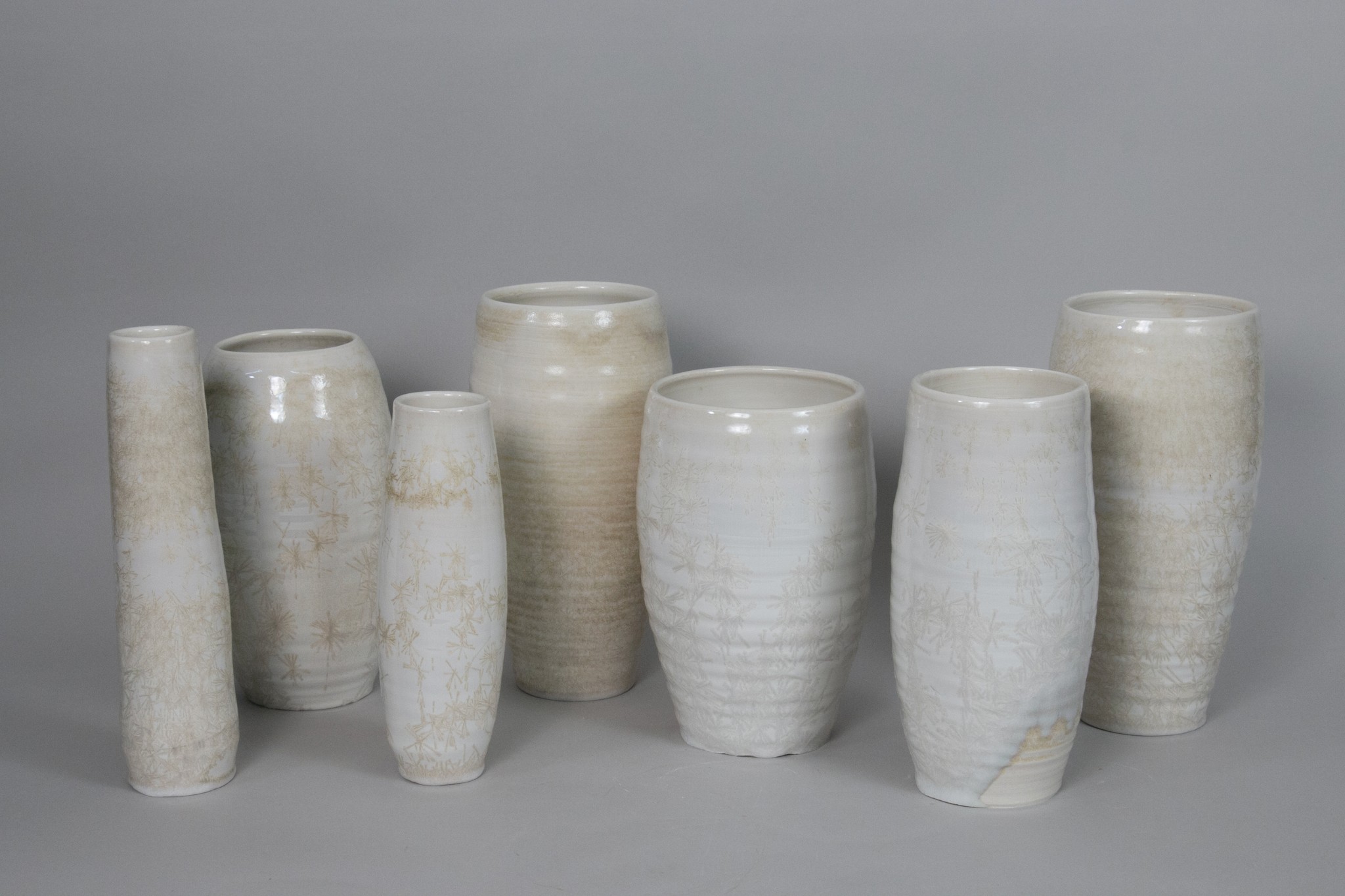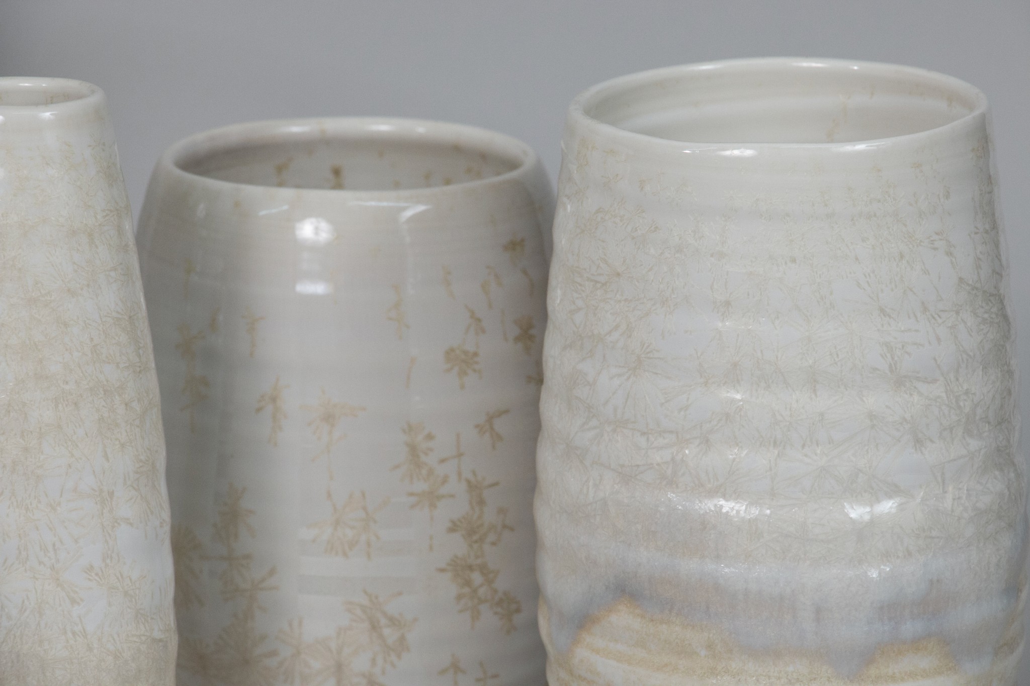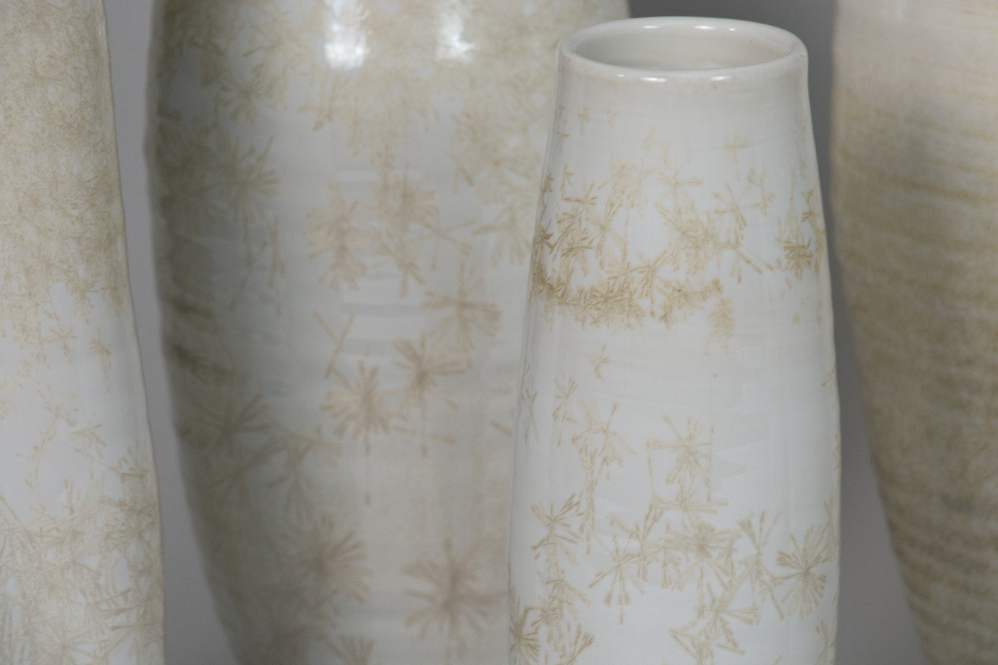 906090 besteht aus zwei gruppen von ausgewählten vasen mit jeweils sieben stück. die vasen wurden mit einer selbst entwickelten kristallglasur aussen und einer transparenten porzellanglasur innen glasiert. die intuitiv im moment der schaffung enstandenen formen ergeben spannende zusammenstellungen und haben einen emotional geladenen ausdruck. die kristallglasur verstaerkt jeder vase ihre einzigartigkeit mit unkontrollierbaren kristallinen strukturen.